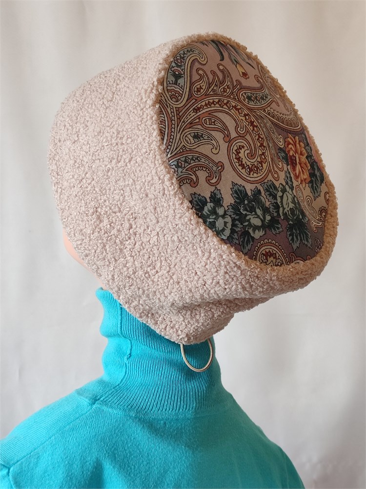Крой довольно свободный, но при этом шапка уверенно сидит на женской голове стандартного размера 55-58, т.к. регулируется сзади на шее резинкой с фиксатором. Шапка кубанка надевается как шапка, мягкая, но держит форму, при этом при складывании не мнется. Смотрится кубанка женственно и стильно